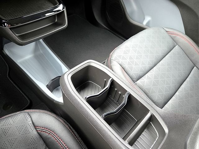 - Folds down and features 2 integrated cupholders and a place to store small items